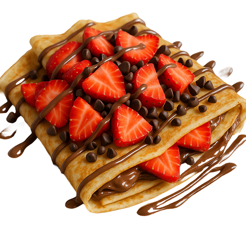 Chocolate Nutella filled, topped with fresh cut strawberries , chocolate chip morsels, and Nutella drizzle